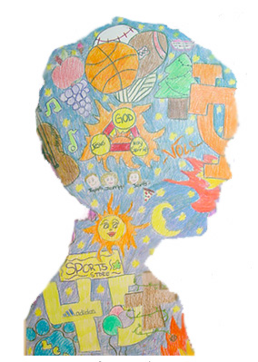 Today we will begin coloring in the symbols on our silhouette. Keep scrap paper handy to practice mixing colors together as well as working out how you want your colors organized. Instruct the students to pay attention to detail and use vivid color. In the end the white paper should be filled with color. If white is necessary, a white pencil should be used. Selecting color requires knowing what will be next to or around each particular symbol. Therefore the students' planning once again becomes very important. Encourage the students to control their pencils. No scribbling is allowed. Building up or layering color creates dynamic visual effects. Have the students work slowly and control their work to get the best result.