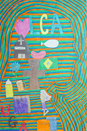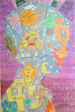 You may begin your class today by simply hanging the work you have done on the wall and stand away from it. Look at what you have done and use the work to inspire some type of background pattern. You will need a background pattern both inside and outside your silhouette. It would be wise to plan some different designs with your colored pencils on scrap paper before you actually begin working. You may use the same design and simply change colors, or you may use the same colors but different designs. Your imagination is your limit. Your background design should serve to unify the entire work. Once you begin filling in the background patterns, remember to color solidly, whether with one color or layering several colors. The entire page needs to be filled. Do not rush your work. Great things are worth great efforts.
