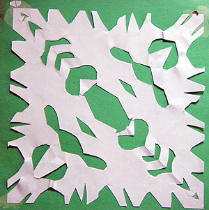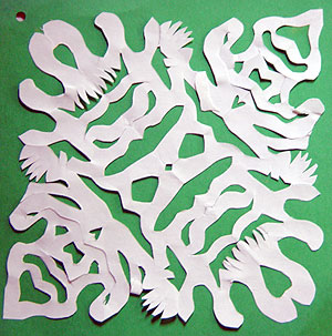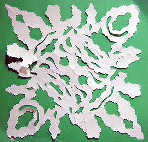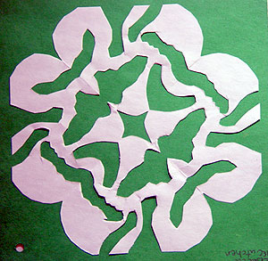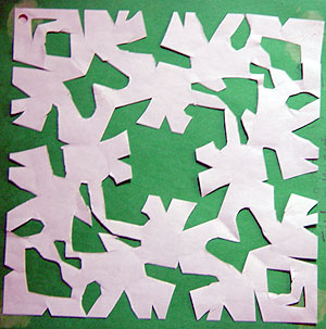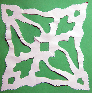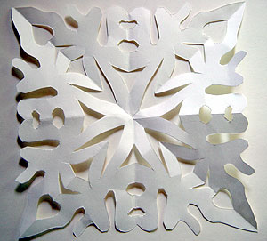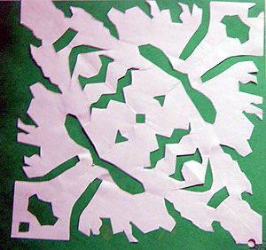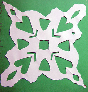 Today we are going practice working with paper and scissors to create design. Have you ever seen a snowflake? Because no two snowflakes are exactly alike, they make wonderful subjects to begin the art of cutting paper. By simply folding our paper and making cuts into it, we can create fantastic radial designs. Begin by folding your paper in half and in half again. You'll notice that one edge of your triangle has four edges. One side has two edges, and has one fold. If you cut the entire length of the single-folded side your paper will fall apart into four pieces. Therefore, cut deep into the paper, but leave enough to hold the paper together. On the edge that has two folds, repeat the same procedure, cutting deeply into the paper with curves or swirls, but be sure to leave some paper to hold it together. The edge that has four single edges will be the perimeter of your snowflake. On this side you may cut an interesting design the full length of the edge. As you work on each edge, you may stop to unfold your paper and see how your design is coming along. If you have large areas of uncut paper, fold your paper again and make deeper cuts to create a more open design. You may have time to cut more than one, two, or even three snowflakes. The more you cut, the more beautiful your snowflakes will become.