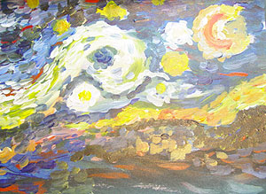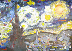 Today we want to complete our Van Gogh-style painting. If you could see his painting in real life, you would notice his thick use with short brush strokes of built-up paint across the entire canvas. If you were able to run your hands across it, you could feel the texture of his brush strokes. We are going to imitate his style by simply taking our brush and dabbing it in the colors we need. Do not mix your colors to make one solid colors, but rather let the mixing take place on the canvas. Begin with your whites and yellows around the moon and the stars. Resist the temptation to make long flowing strokes. Keep using short, quick movements with your brush. Slowly build up your color using blues, greens, and some black. Refer to the actual painting often to help you know where to put what color. Your finished work may likely be rather heavy, filled with paint, and visible brush strokes. Set your paintings aside to dry.