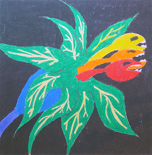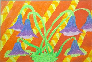 To complete our drawing we need to plan a background. Look at the examples to help you get ideas. You may want to do some quick sketches on scrap paper to help you plan. If your flower takes up most of the paper, a simple background will work well. If, however, your flower does not take up most of the paper you will need to come up with something that has a design or pattern. It would be wise to make a plan in several different color schemes to chose the one that will compliment you flower. Once you have completed coloring in your background design go back into your work with the darker colors, (i.e. black, purple, dark blue, etc.) and add those where needed. Before you call your work finished be sure that you have a range of values in your flower and that your entire paper is covered over with oil pastel. If you colored lightly you may need to go back into it and either color more solidly or blend colors to make sure your paper is colored over.