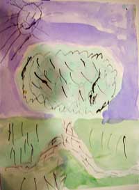 Distribute the watercolor paintings from last week and distribute drawing sticks and ink. Explain that we will be using a material that can be very messy and they need to stay in their seat and follow directions carefully. Explain that we are going to enhance our painting by drawing thick and thin black lines to delineate the tree. Remind them that we have done this type of things when we were studying lines and looking at winter trees. Begin with the treetop by putting small strokes of curved lines to indicate the leaves. Continue onto the trunk by drawing the bark with thick and thin lines to create the tree trunk texture. Add some small, short strokes to create grass around the bottom of the trunk and throughout the ground. Work thoughtfully and neatly.