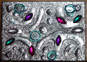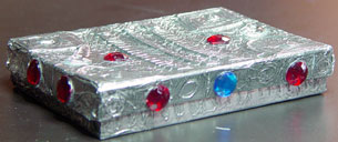 Today we will finish our treasure boxes by giving them and the look of old or aged metal. If you have smocks for the children to wear it might be a good idea to distribute them. Also, if you have any students that do not deal well with messy hands, you might give them a pair of disposable gloves. To give our box that aged look we first take paper towels and pour a small amount of black ink on them and begin rubbing across the surface. Pressure should be applied in order to get the ink to flow into the recesses of the design. All of the aluminum foil should be treated to get a consistent look. Once ink has been spread across and pressed down into the recesses, take a clean paper towel to polish off the ink from the raised surfaces. This contrast creates a lovely effect. The inking process should take about 15 20 minuets. When it is complete, the students may use white glue to secure some jewels for added decoration if they are available. Limit the number of jewels as to many can overpower the finished work. Set the boxes aside to dry. If felt is available, cut rectangles the size of the bottom and top of the box and use white glue to keep each piece in place.
